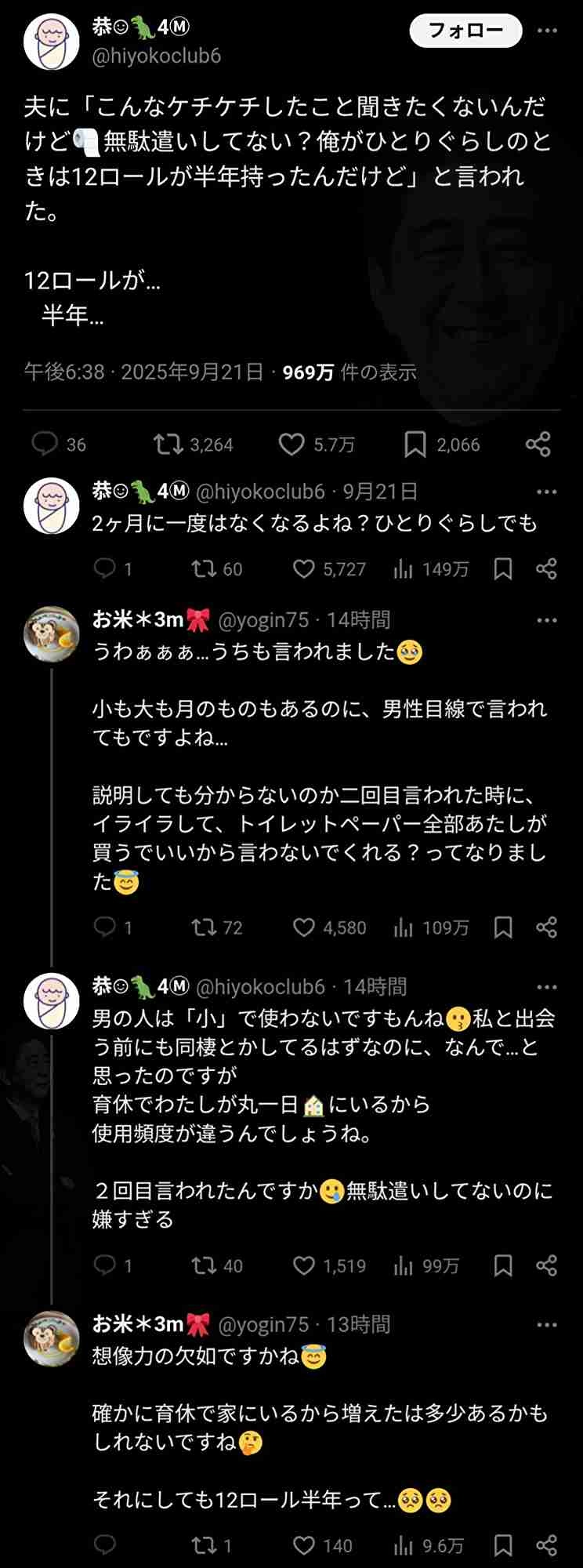 男の感覚からすると何に使ってんだってくらい減る - 21 名前:ここからは表現の自由でイカせていただきます 投稿日時:2025/09/23(火) 00:30:08.52 ID:8nXDtNvx0