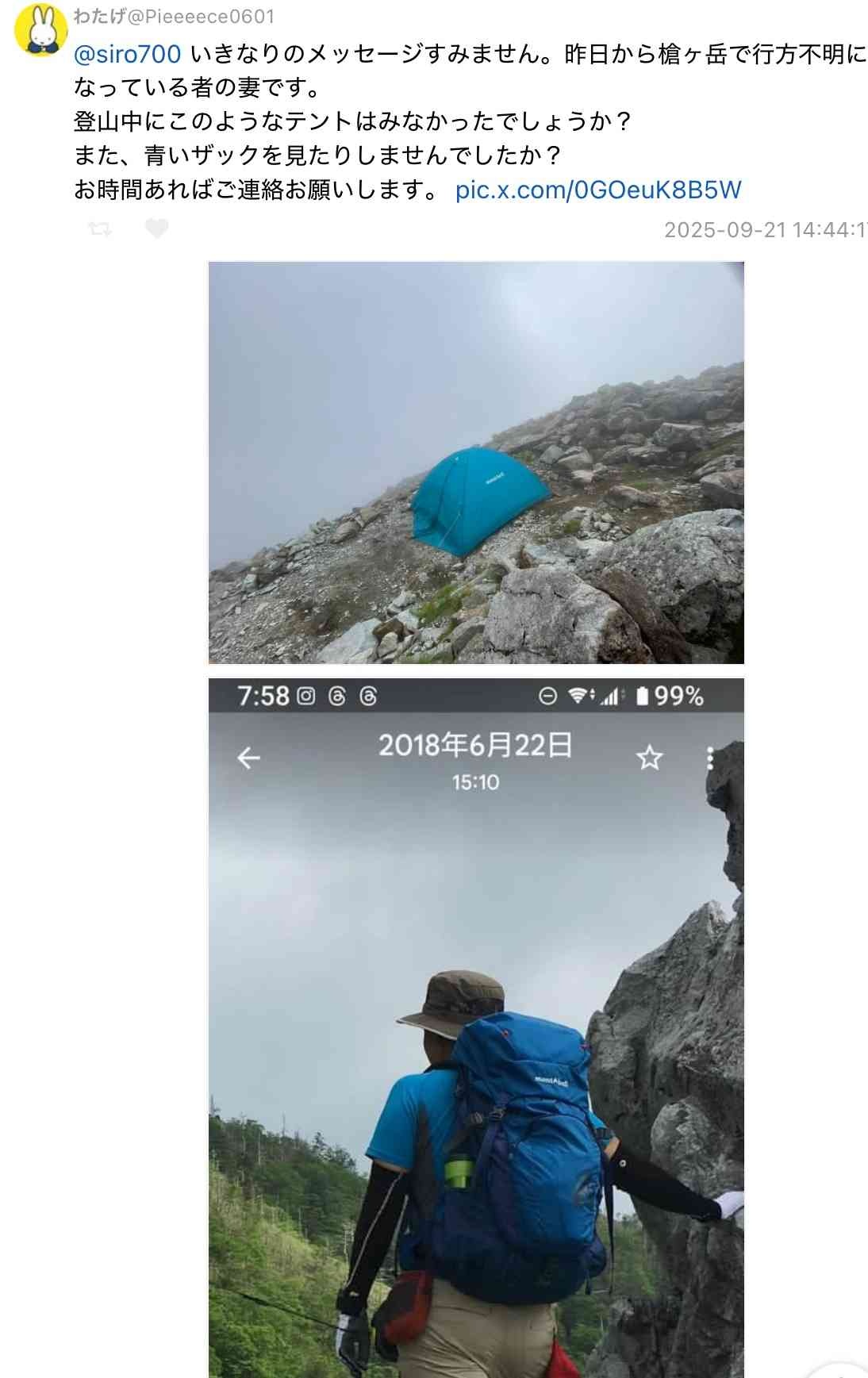 槍ヶ岳で33歳の公務員が死亡 妻がTwitterで情報提供を呼び掛けていた