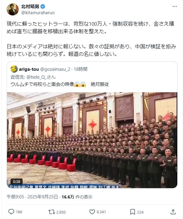 北村晴男「現代に蘇ったヒットラー習近平は、強制収容を続け、金で臓器を移植出来る体制を整えた、日本のメディアは報じない