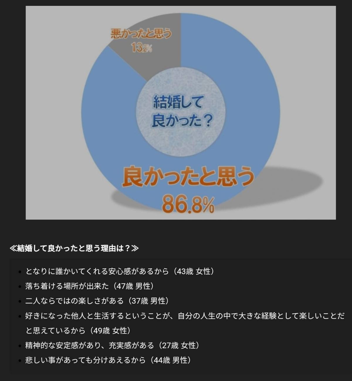 - 良かったと思う理由に全然共感できないし俺は結婚向いてないわ