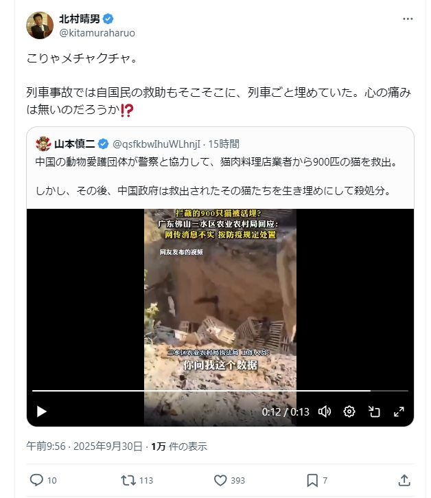 北村晴男「中国の動物愛護団体が猫肉料理店業者から900匹の猫を救出、中国政府は救出された猫を生き埋めにして殺処分