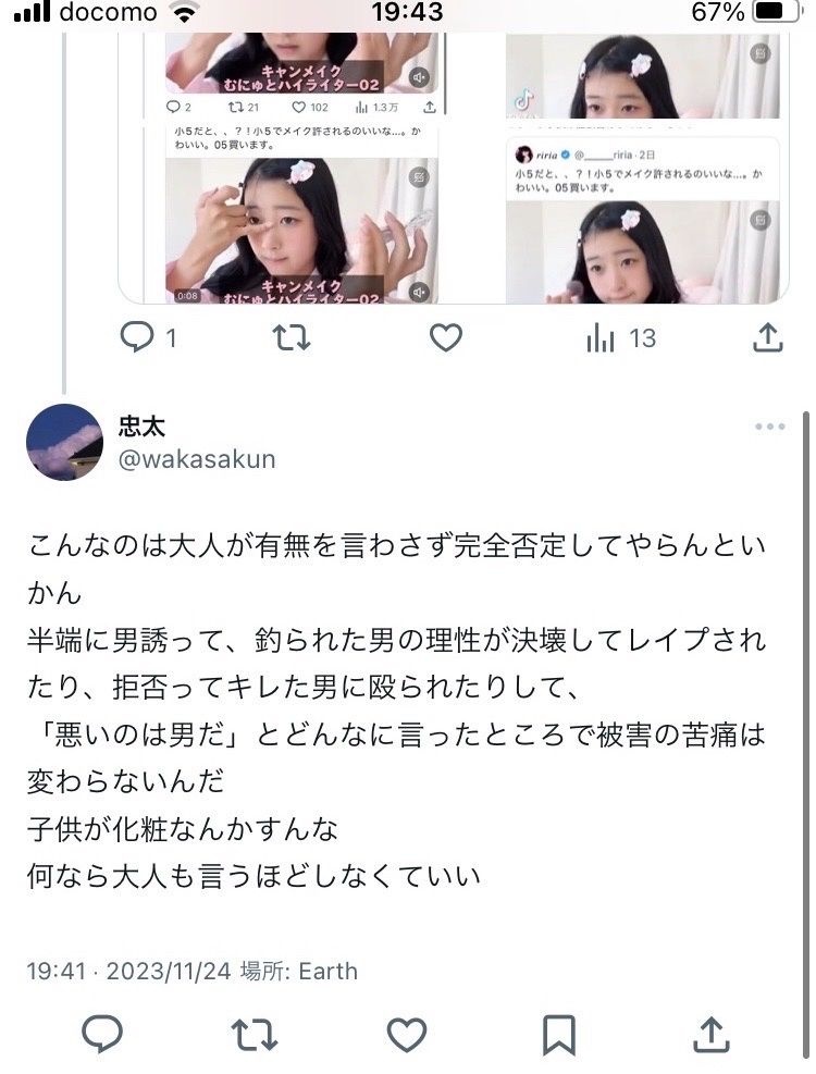 化粧なんて個人の自由なんだからムラムラするからやめろ!とかガキに発情してる方が遥かにヤベー上に気持ち悪すぎるわ - 29 名前:ここからは表現の自由でイカせていただきます 投稿日時:2025/10/01(水) 19:54:48.83 ID:M5YR1VQ40