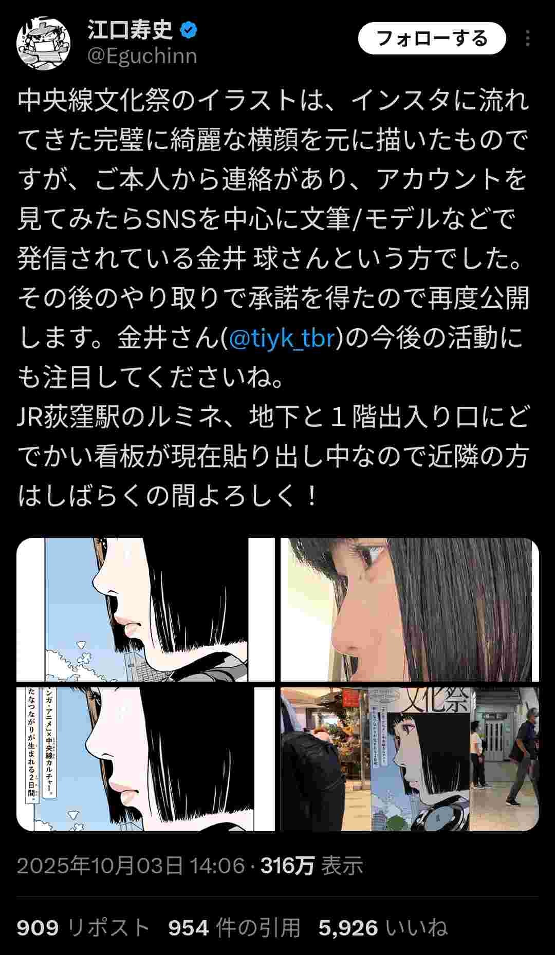 Xでは「中央線文化祭のイラストは、インスタに流れてきた完璧に綺麗な横顔を元に描いたものですが、ご本人から連絡があり、アカウントを見てみたらSNSを中心に文筆/モデルなどで発信されている金井球さんという方でした。その後のやり取りで承諾を得たので再度公開します」と報告。