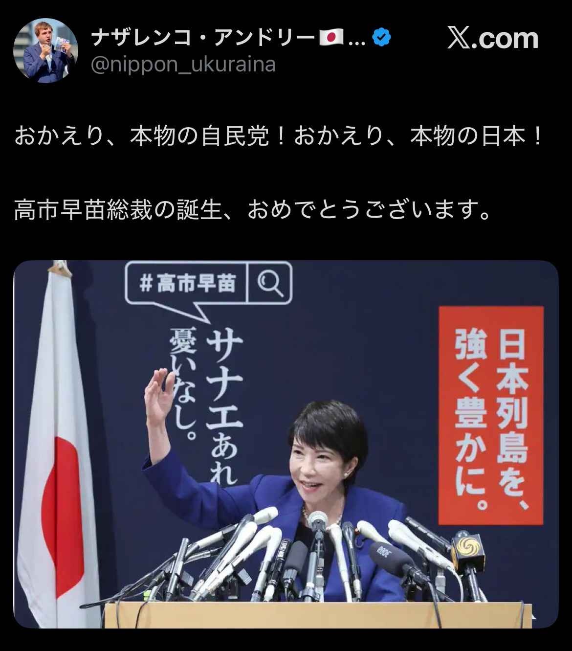 ナザレンコ「高市早苗総理おめでとう!おかえり、ホンモノの自民党」