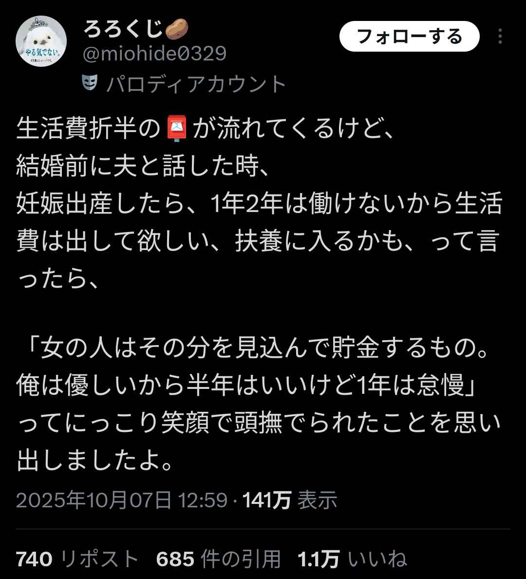 まあ1みたいなこと言う女にはさっさと働けと言いたくはなるが - 39 名前:ここからは表現の自由でイカせていただきます 投稿日時:2025/10/08(水) 07:57:42.59 ID:N2cmQhT30