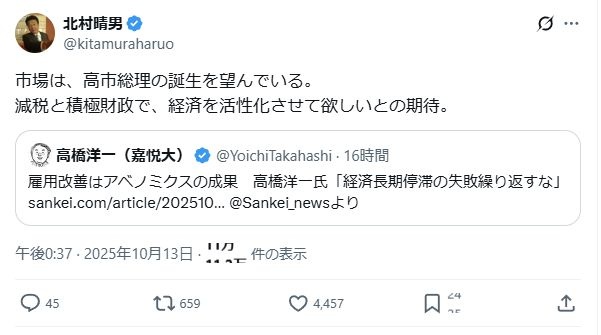 北村晴男「市場は高市総理の誕生を望んでいる。減税と積極財政で、経済を活性化させて欲しい」→雇用改善はアベノミクス成果