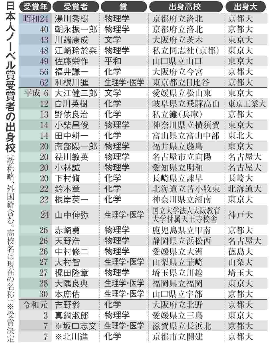 日本人ノーベル賞受賞者の出身校一覧 東大を抜いて京大がトップに 高校は地方公立が優勢(産経新聞) – Yahoo!ニュース