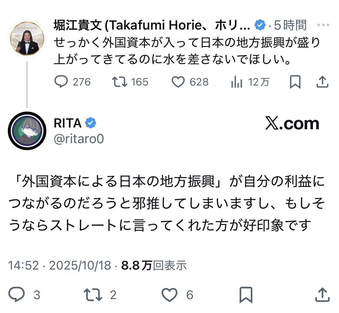 海外資本で投資して価値上がったら文句言いだすのもずるいわな - 143 名前:ここからは表現の自由でイカせていただきます 投稿日時:2025/10/18(土) 17:28:31.07 ID:vd1MbGCA0