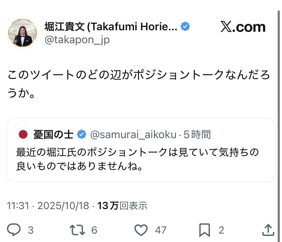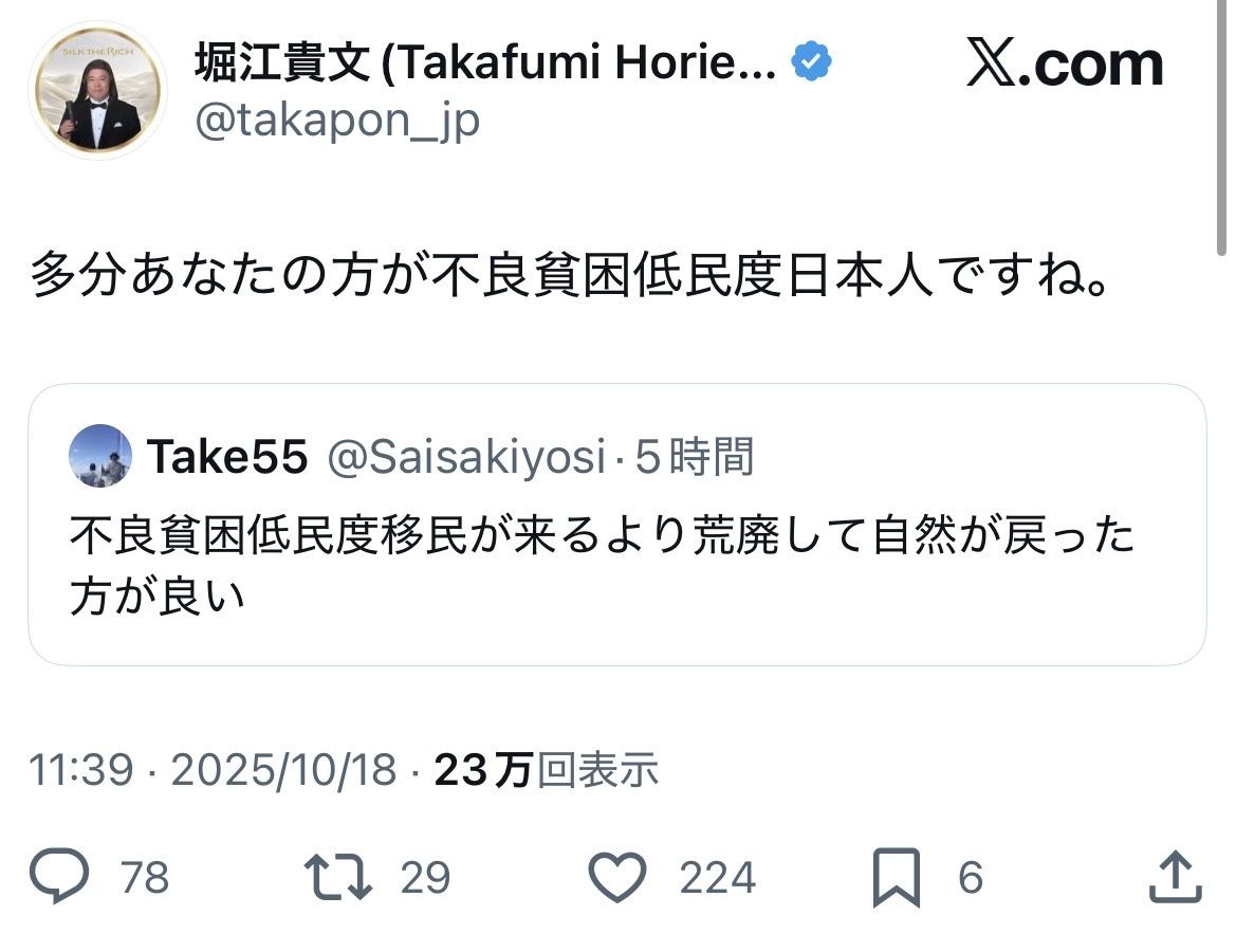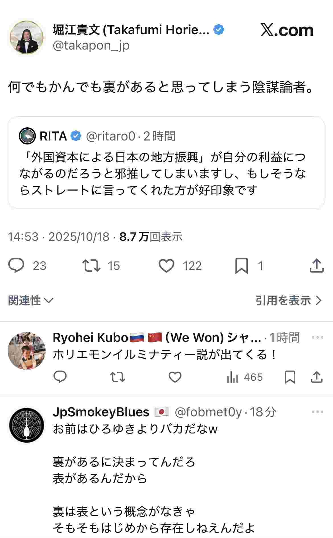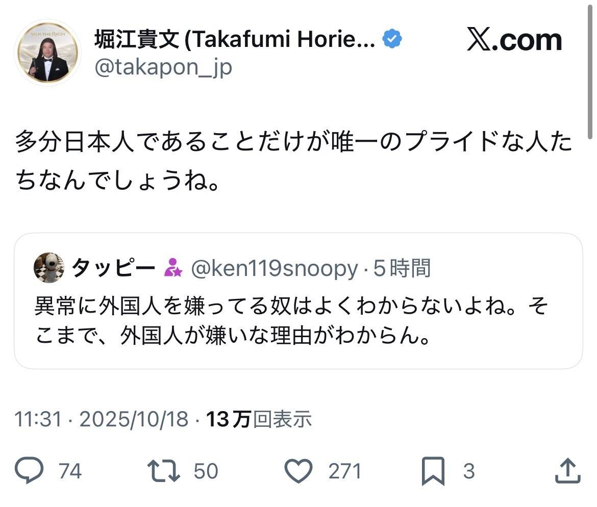 - 反参政党だし反高市だし最近のホリエモンはネトウヨ裏切りまくりだからな