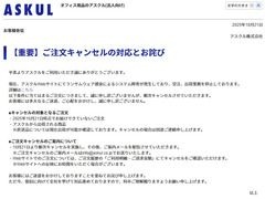 キャンセルとなる場合は別途案内するとしている。同日からキャンセル処理を順次始め、処理が完了した注文から順次メールで通知する。案内メールは「info@askul.co.jp」のアドレスから送信する。