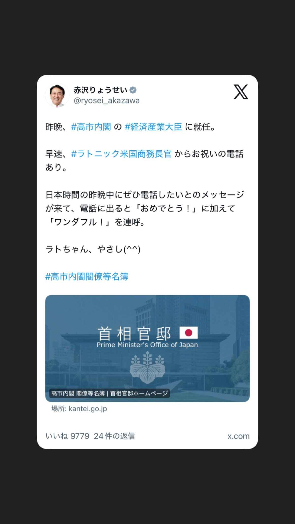 赤沢経済産業大臣、アメリカの商務長官から直々に祝意を受ける…これもう次期総理の器だろ