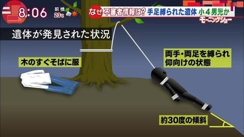 同署が男児の立ち回り先を捜し、遺体を発見した。遺体は崖地に横たわっており、首には約1・5メートル離れた木の幹にくくられたビニールひもがつながれていた。