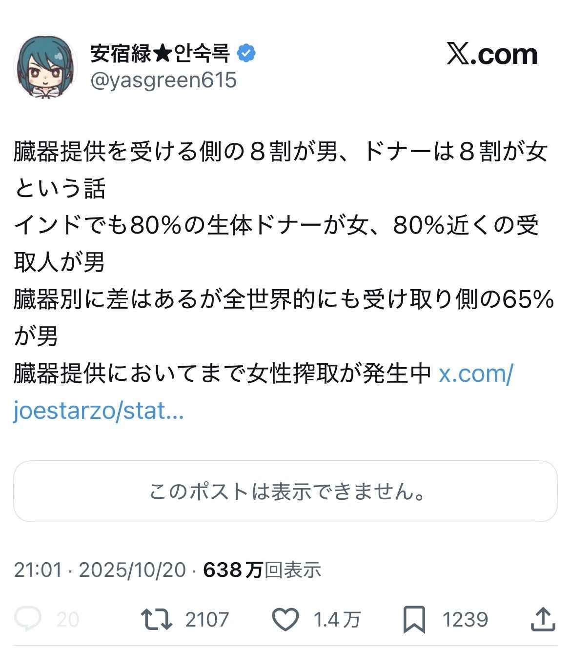 女性「臓器提供を受ける側の8割が男、ドナーは8割が女。女性搾取だ!」