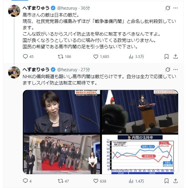 へずまりゅう「高市さんの敵は日本の敵、社民党党首の福島みずほが戦争準備内閣と批判殺到、スパイ防止法を早めに制定するべき