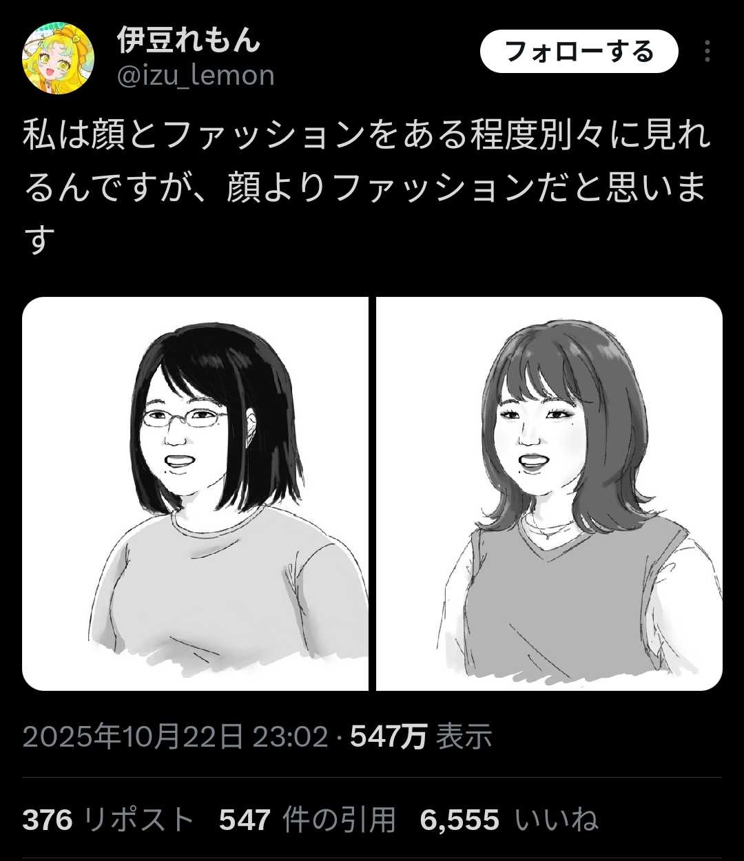おしゃれだと何割り増しかに見えるんよ - 15 名前:ここからは表現の自由でイカせていただきます 投稿日時:2025/10/23(木) 22:52:01.18 ID:Bp6N3cdx0