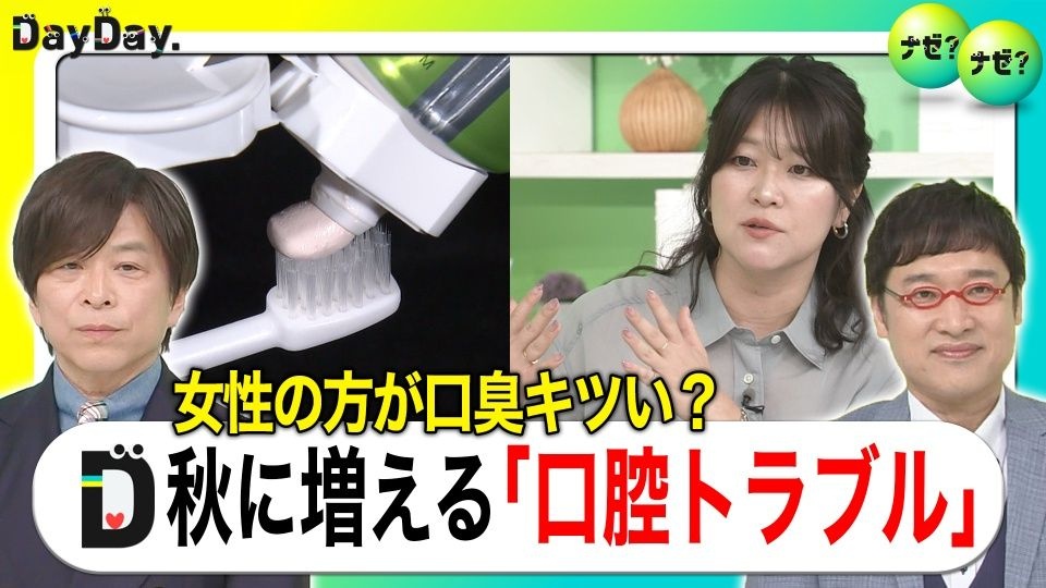 歯科医師によると、今の季節は口腔トラブルが起きやすく「湿度がだいぶ落ちてきて、季節の変わり目になりますのでみなさん疲れがでやすかったり、唾液でうるおわないので、口が乾くことによってニオいというのは外に出やすいものですので、口臭のトラブルというものにつながりやすいです」と解説しています。