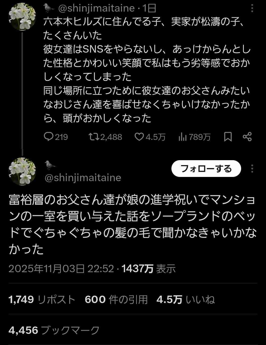金持ちは色々と次元が違いすぎ - 31 名前:ここからは表現の自由でイカせていただきます 投稿日時:2025/11/05(水) 19:17:16.99 ID:g5IxTpHr0