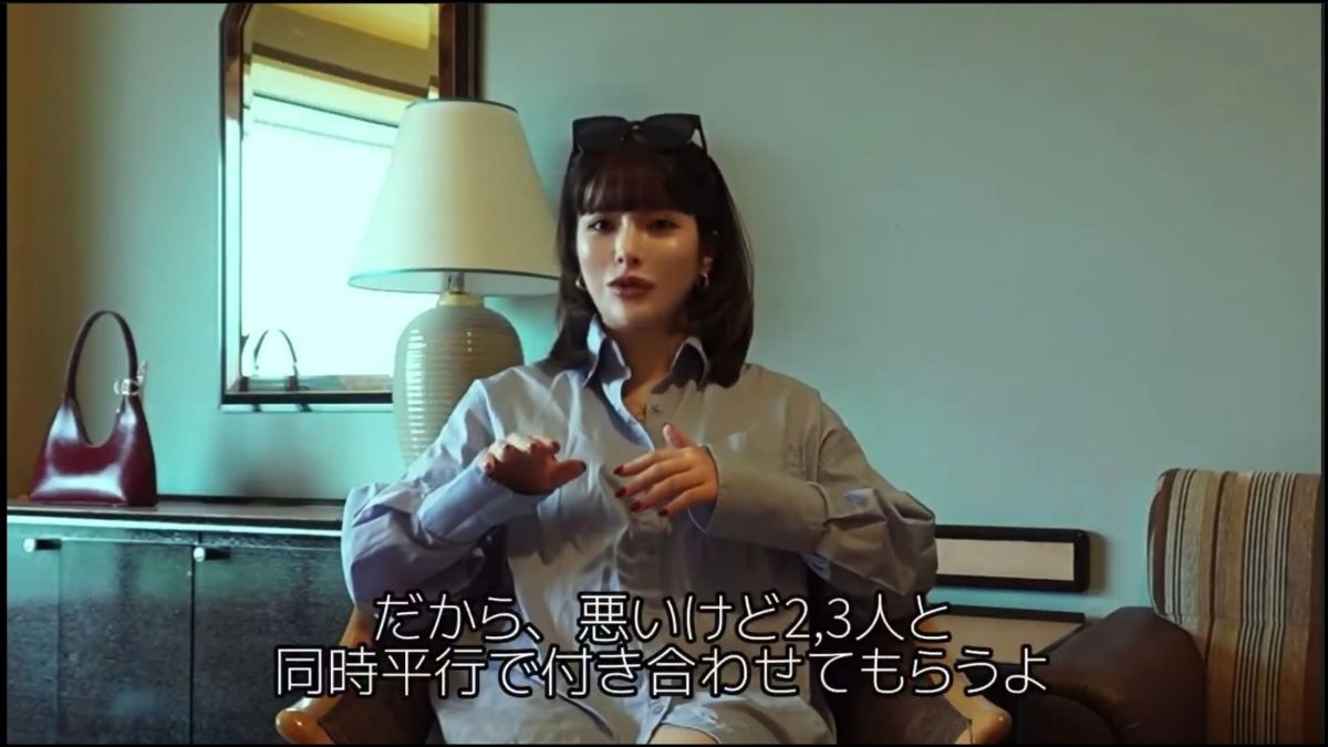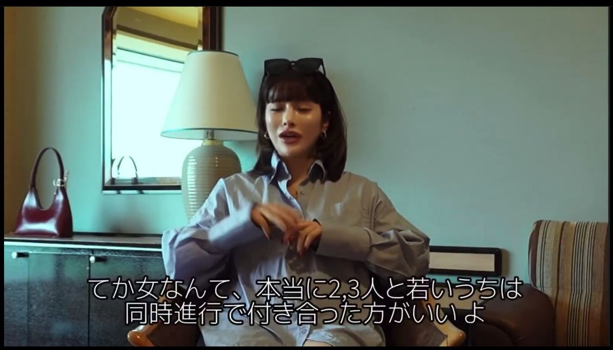 「だってさ、30(歳)までに結婚とか考えた時にさ、あまりに時間が短いじゃん、それでさ2年とか3年とか、同じやつと付き合っちゃってさ。それでさ、ふた開けたらモラでしたとかさ、ふた開けたら実家変な宗教入ってましたとかさ。そういうのが分かったらさ、取り返しつかないのよ、女は。だから悪いけど、2、3人と同時進行で付き合わせてもらうよ」と主張した。
