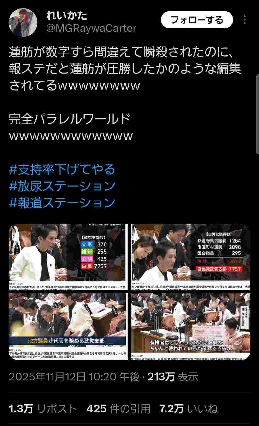 ネトウヨ「蓮舫間違えて瞬殺www報ステだと蓮舫圧勝のパラレルワールドwww」7.2万いいね😨実際は高市政権の間違い