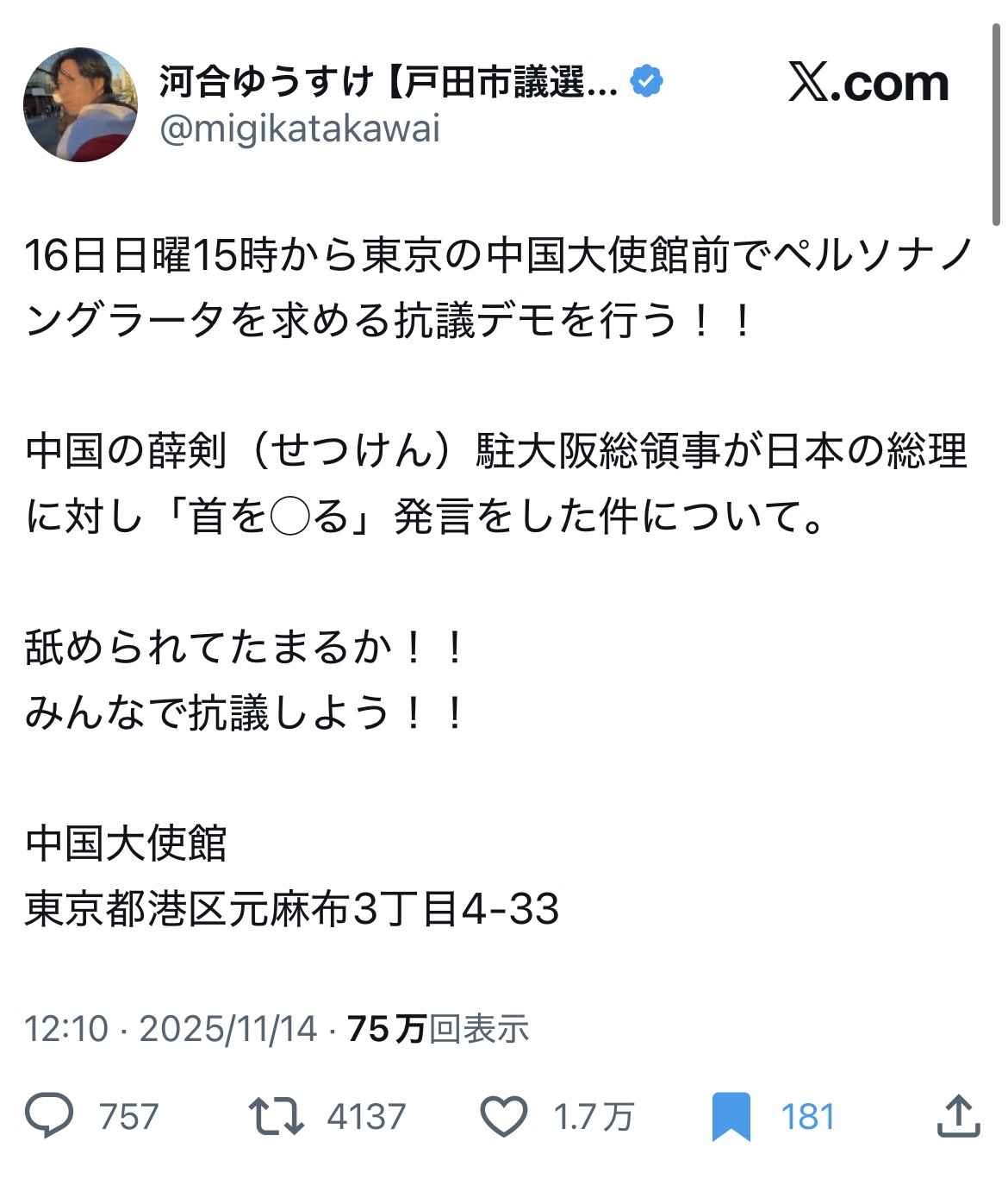 河合ゆうすけ【戸田市議選歴代最多得票トップ当選】1st (@migikatakawai) on X16日日曜15時から東京の中国大使館前でペルソナノングラータを求める抗議デモを行う!! 中国の薛剣(せつけん)駐大阪総領事が日本の総理に対し「首を◯る」発言をした件について。 舐められてたまるか!! みんなで抗議しよう!! 中国大使館 東京都港区元麻布3丁目4-33x.com - 8 名前:ここからは表現の自由でイカせていただきます 投稿日時:2025/11/15(土) 17:02:37.10 ID:46boHj6Z0