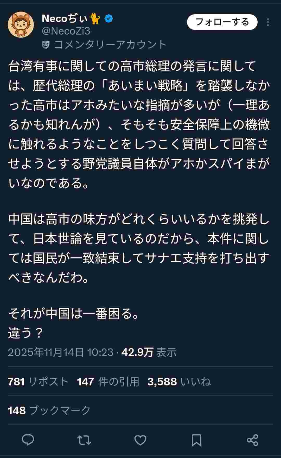 サナたんの発言こそ日中の戦略的互恵関係に背くものではないか?