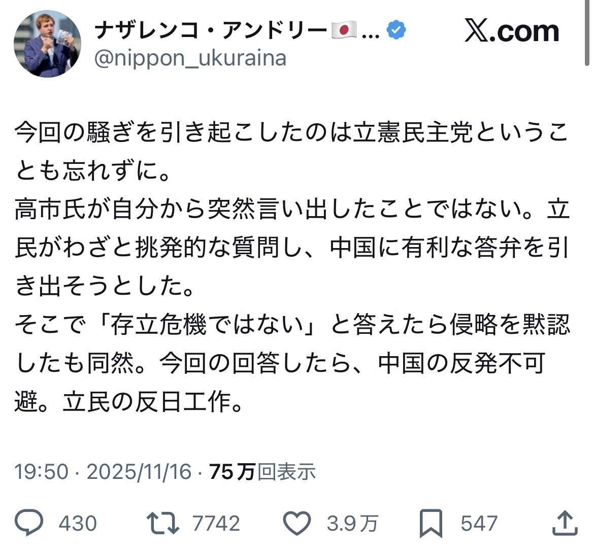 ナザレンコ・アンドリー「騒ぎを起こしたのは立憲。高市さんが突然言い出したことでは無い。わざと挑発した!立憲の反日工作!」