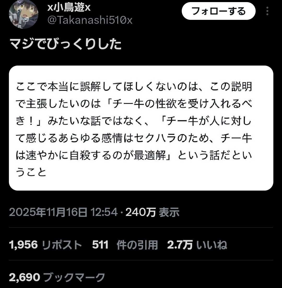 お前のようなものを殺せばチー牛の役には立つぜ - 17 名前:ここからは表現の自由でイカせていただきます 投稿日時:2025/11/17(月) 20:14:36.27 ID:VZFJSCVY0