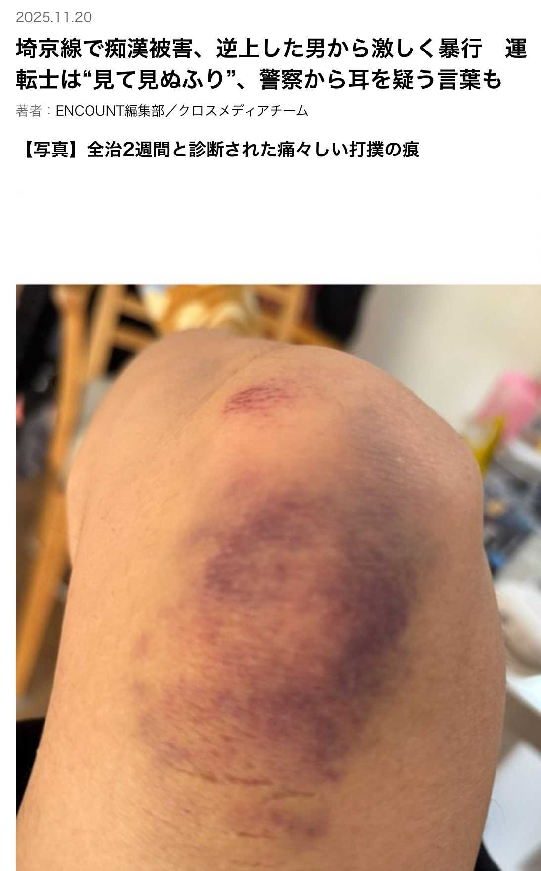 埼京線で痴漢され逆らった女性、日本男性に殴る蹴るの暴行を受けアザまみれになる。駅員もグルで警察への届けを止めようとする