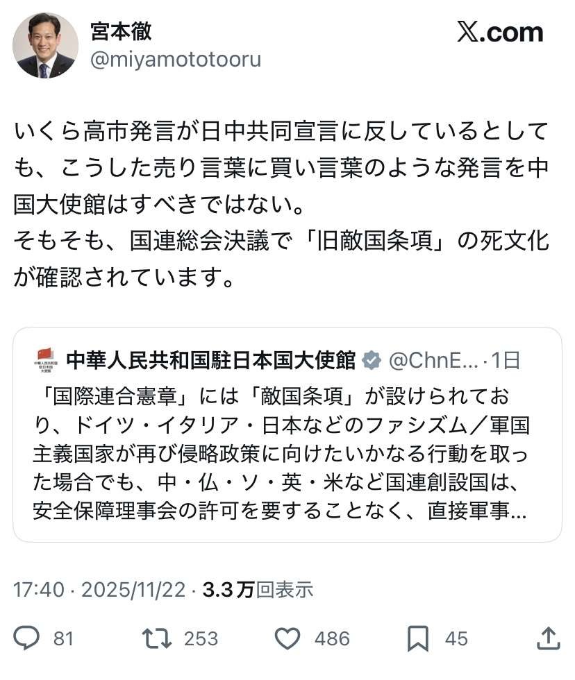 共産・宮本徹「高市発言が日中共同宣言に反しているとしても、こうした売り言葉に買い言葉のような発言を中国大使館はすべきではない。」