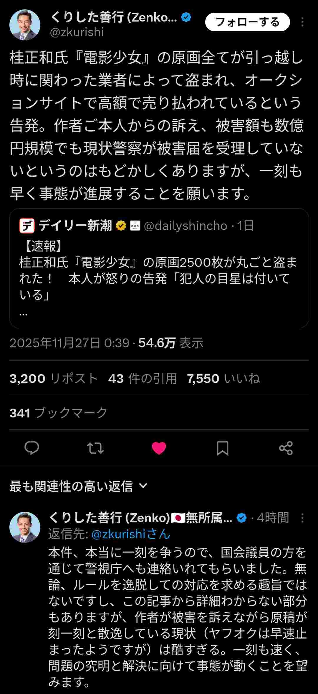 億単位の価値がついてるものを盗まれて売買されて被害届受理しないとかありえない - 15 名前:ここからは表現の自由でイカせていただきます 投稿日時:2025/11/27(木) 18:37:13.57 ID:rxvUTGhQH