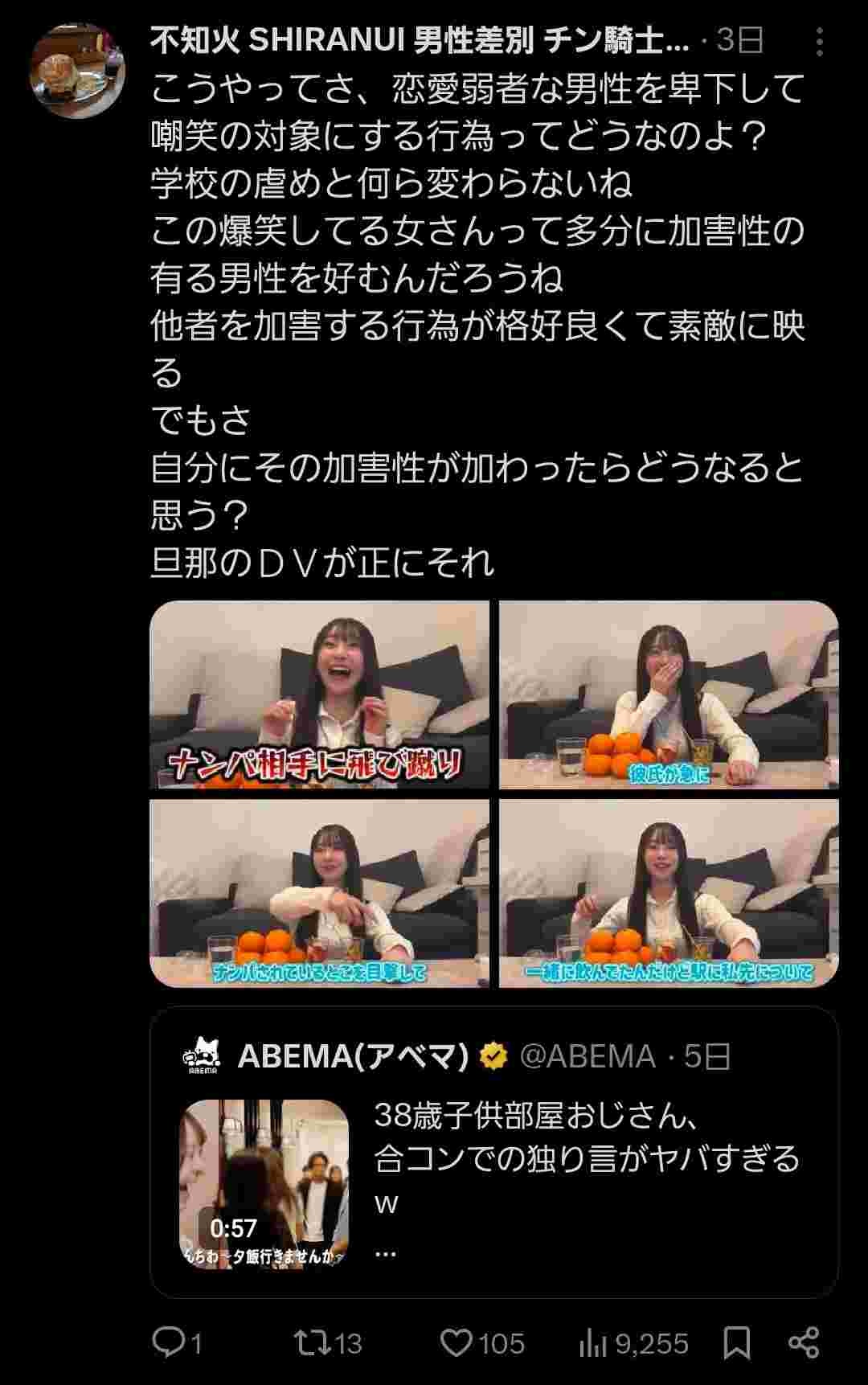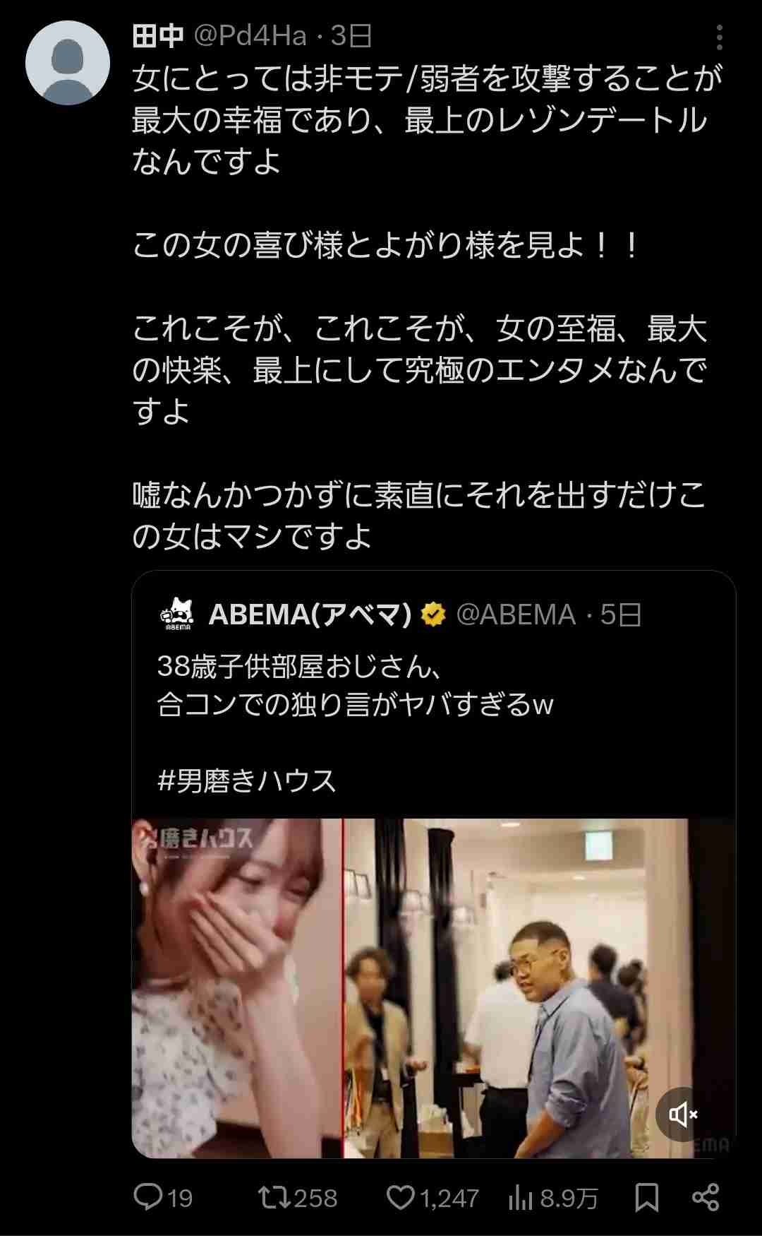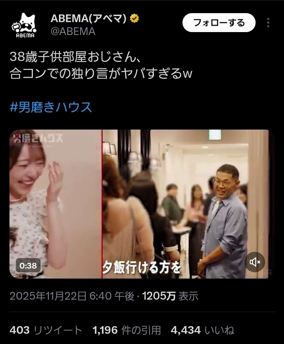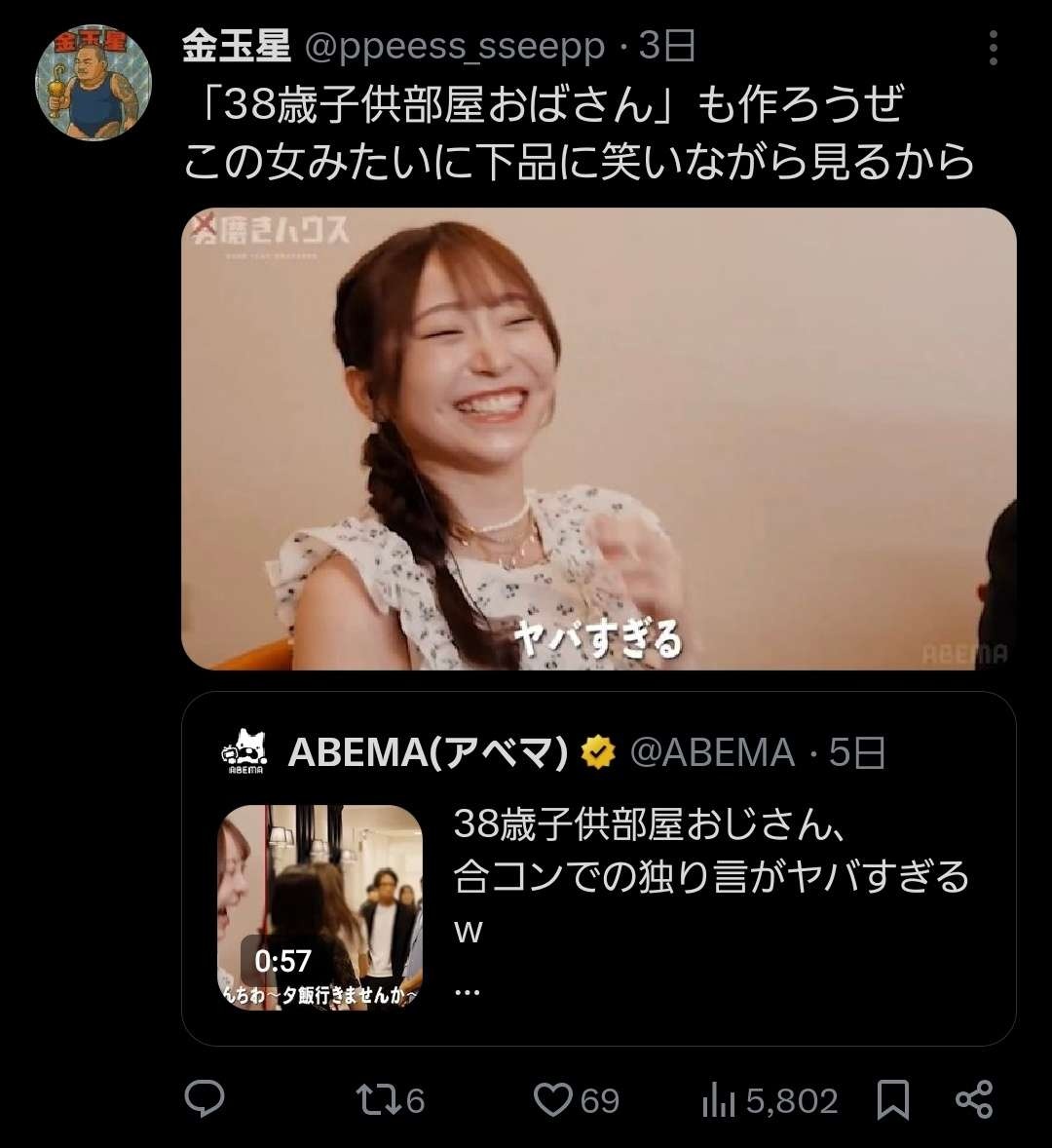 ABEMA(アベマ) (@ABEMA) on X38歳子供部屋おじさん、 合コンでの独り言がヤバすぎるw #男磨きハウスx.com - 2 名前:ここからは表現の自由でイカせていただきます 投稿日時:2025/11/27(木) 22:17:32.29 ID:U6UWUClB0
