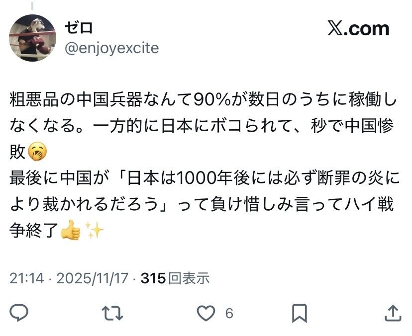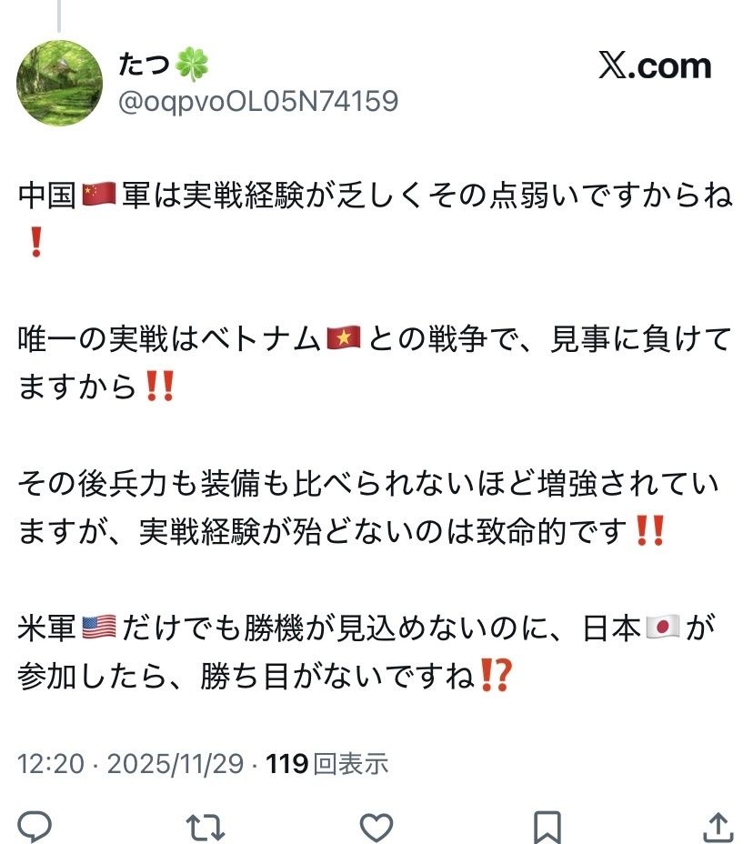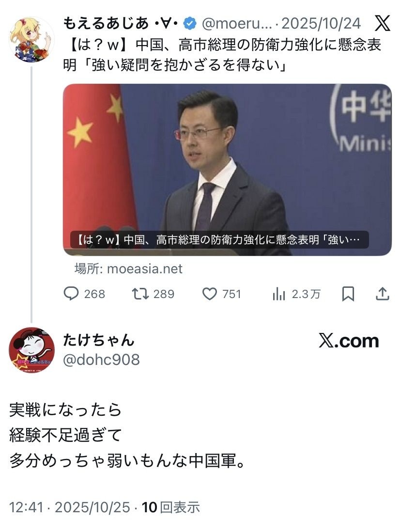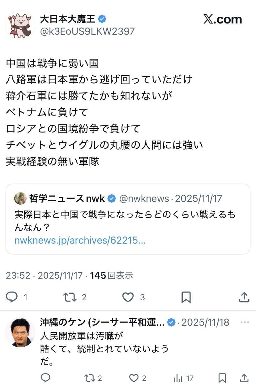 ククク…人民解放軍よ、怖いか? - 48 名前:ここからは表現の自由でイカせていただきます 投稿日時:2025/12/01(月) 20:48:52.69 ID:BfphAeKp0