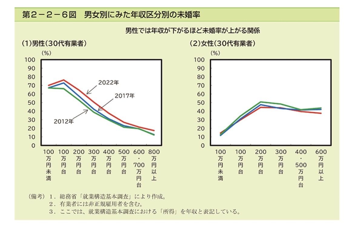 第2-2-6図 男女別にみた年収区分別の未婚率 - 内閣府内閣府のホームページです。内閣府の組織、政策、報道発表資料、統計・調査などに関する情報を掲載しています。www5.cao.go.jp - 2 名前:ここからは表現の自由でイカせていただきます 投稿日時:2025/12/10(水) 13:07:26.03 ID:CUPNdcgH0
