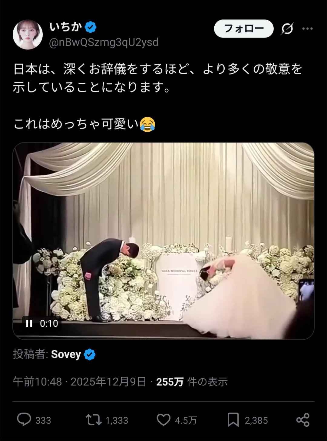 愛国者「日本では深くお辞儀をするほど敬意を表してる事になります💕日本のお辞儀文化って素敵…」韓国の映像でした