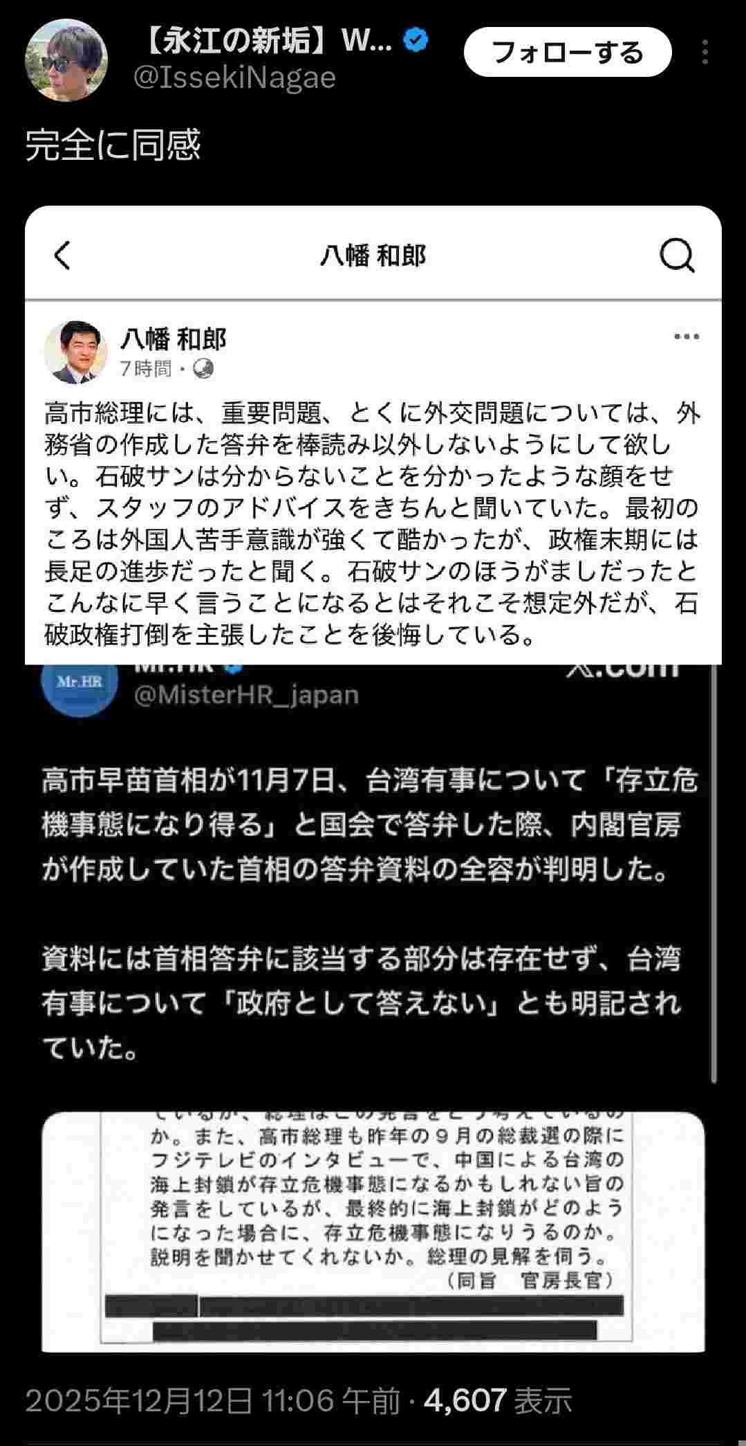 アメリカも台湾もこれ以上揉めさせるなという反応だしさ - 27 名前:ここからは表現の自由でイカせていただきます 投稿日時:2025/12/13(土) 12:21:48.02 ID:fb2LFyWy0