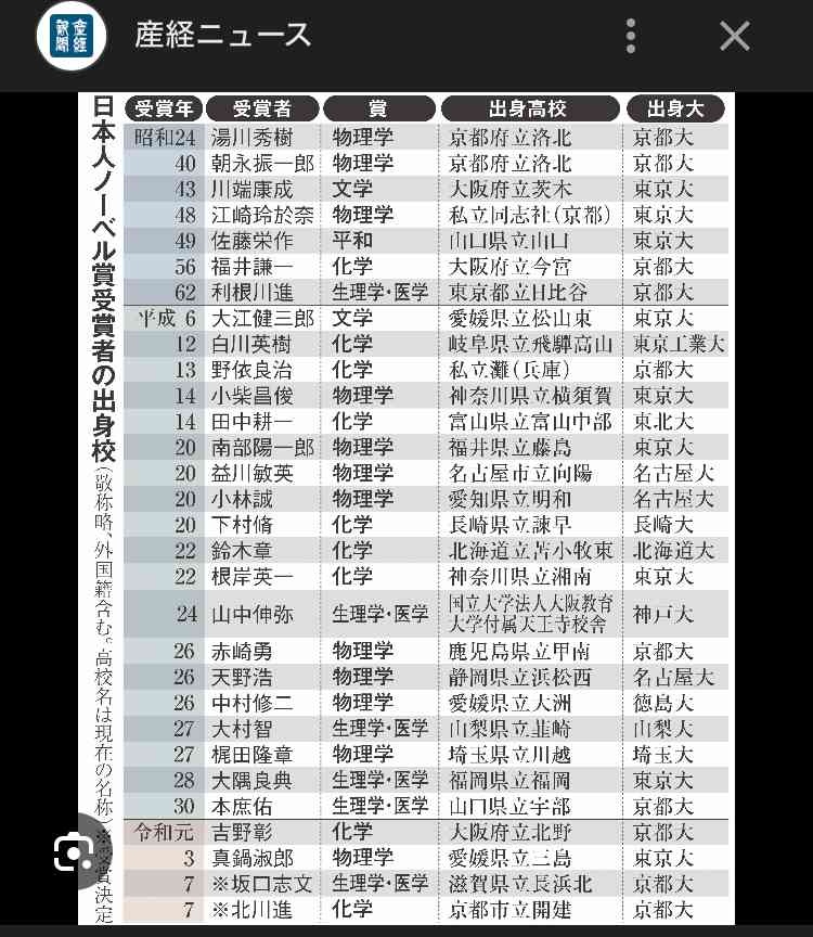 日本人ノーベル賞受賞者の出身校一覧 東大を抜いて京大がトップに 高校は地方公立が優勢(産経新聞) – Yahoo!ニュース