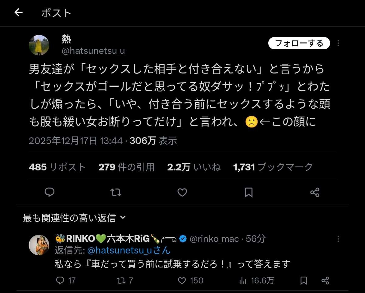 X男性「セクロスした相手とは付き合えない」⇦ヤリマンどもから嘲笑される 2.2万いいね