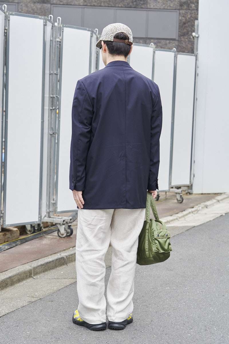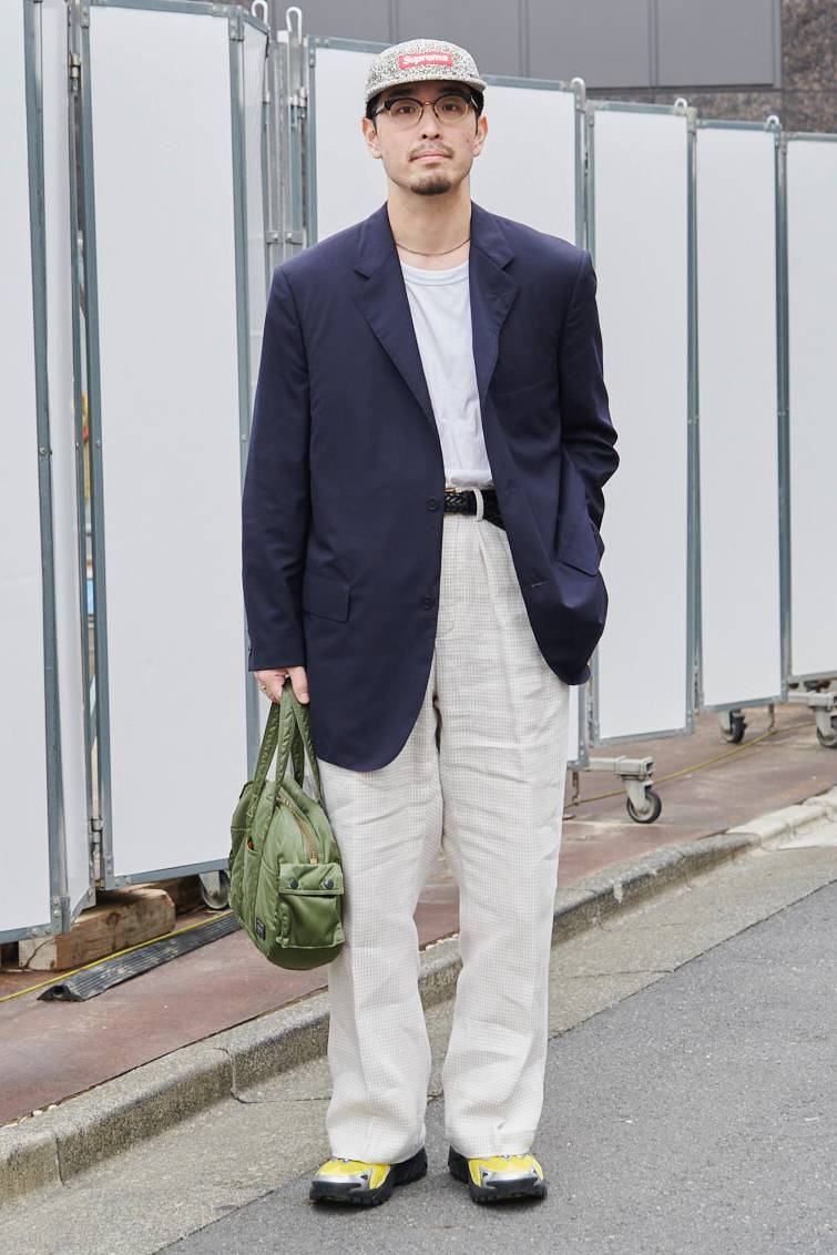 ジャケット=リパーパス パンツ=ニート シューズ=ルイ・ヴィトン 帽子=シュプリーム 眼鏡=トムブラウン バッグ=ポーター 腕時計=カルティエ ネックレス=ナバホ バングル、リング=ともに市松 リング2=古着 ベルト=ギャップ
