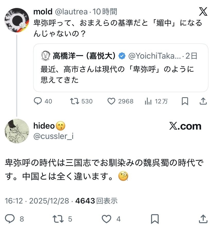 卑弥呼の”外交姿勢”は、高市首相の政治信条とは逆ととらえる人が多いだけに、「私は天照大神に見えています」「まさに令和のヒミコだと思います」と高橋さんに賛同する意見もみられるものの、ネット上では少数派。「つまり中国にかしずくべきだって言いたいの?」「はやく魏に認められて金印もらえるといいですね」「おかしいなあ。卑弥呼は中国(魏)への朝貢外交に熱心だったんだけどね。そうか高橋洋一さんは中国に礼を尽くせと高市総理に言っているのかも」「これは褒めているのかディスっているのか、解釈が分かれるところ。小ばかにしつつ褒めているのか」などの声が上がった。