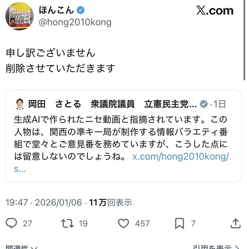 デマ拡散がその理由になり得るから - 41 名前:ここからは表現の自由でイカせていただきます 投稿日時:2026/01/07(水) 16:20:57.84 ID:eCWVDDip0
