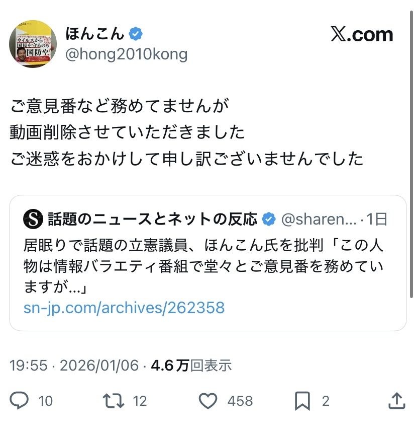 馬鹿が服着て歩いてるようなのが謝れて偉い - 34 名前:ここからは表現の自由でイカせていただきます 投稿日時:2026/01/07(水) 16:19:10.79 ID:RNOegMZH0