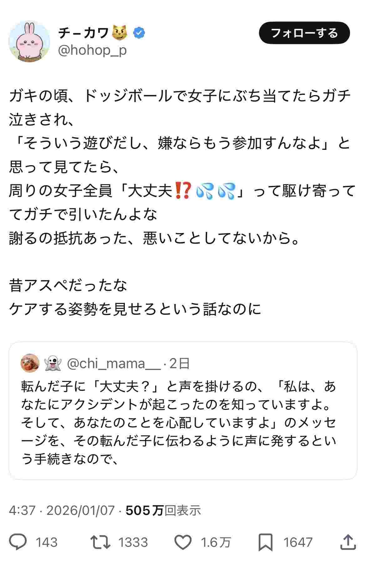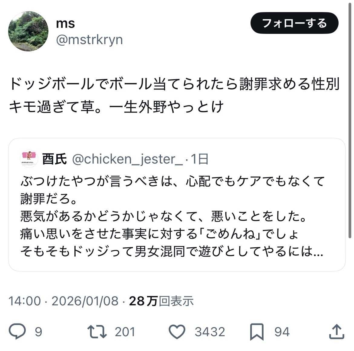 女さん「ドッヂボールでボールぶつけたら謝るくない?泣くほどのパワーで投げなくてもいいじゃん」