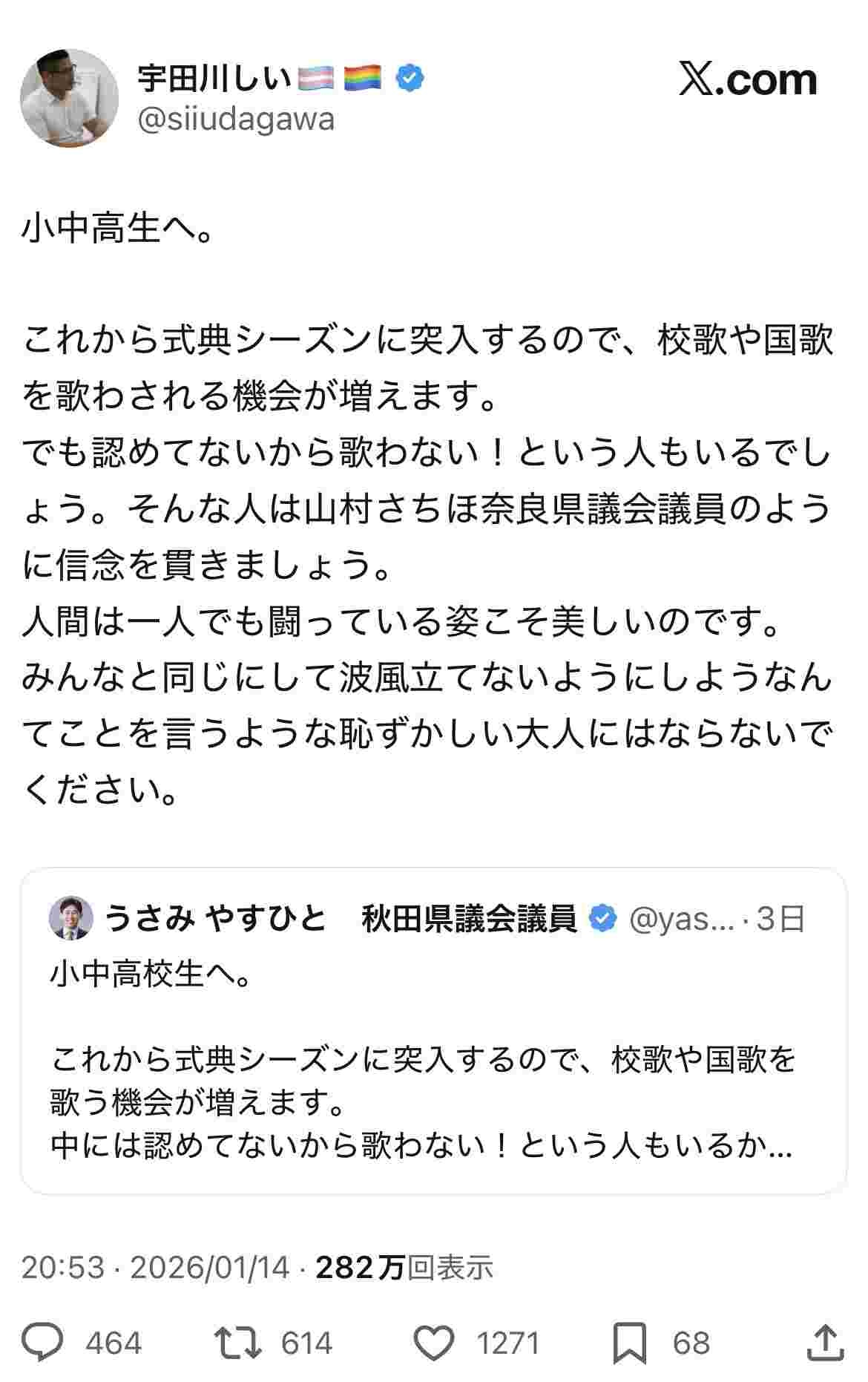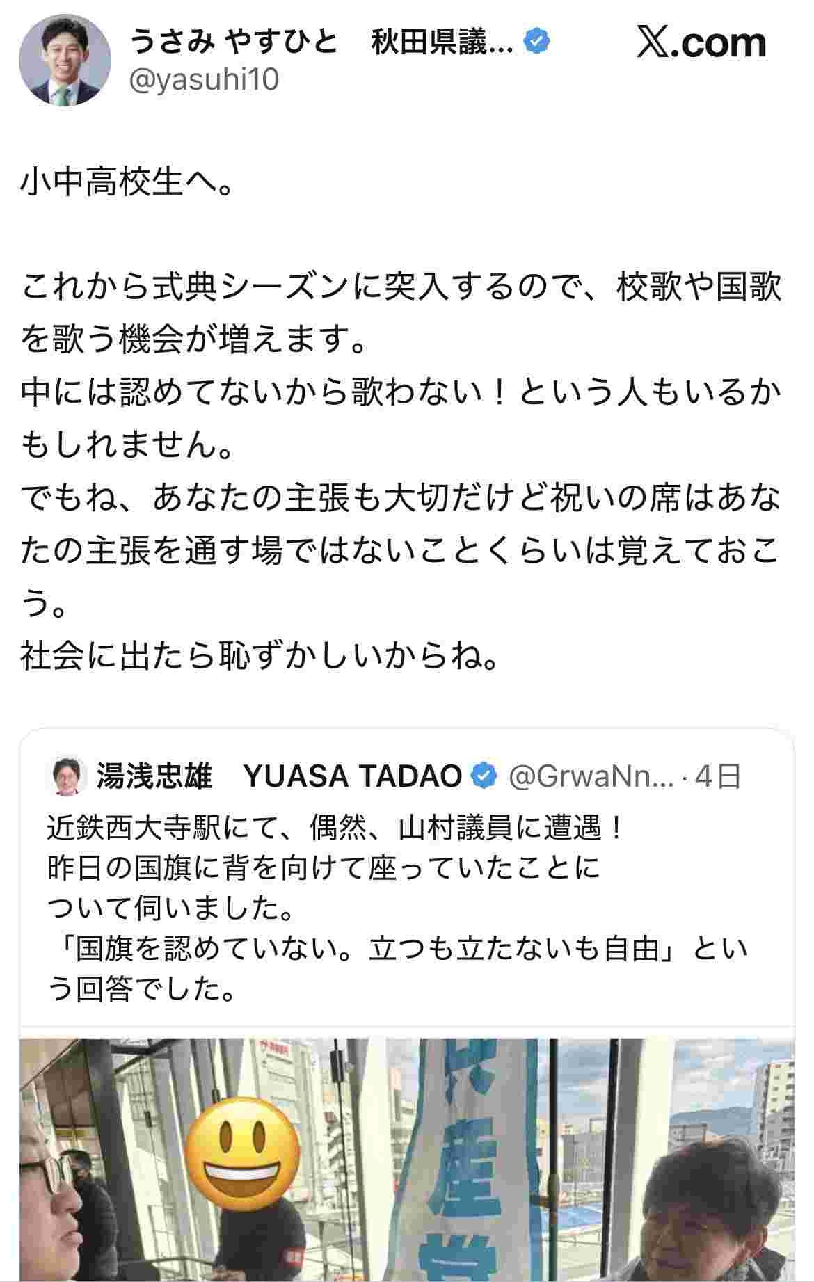 - でもこいつ学校で国歌歌ってないじゃん