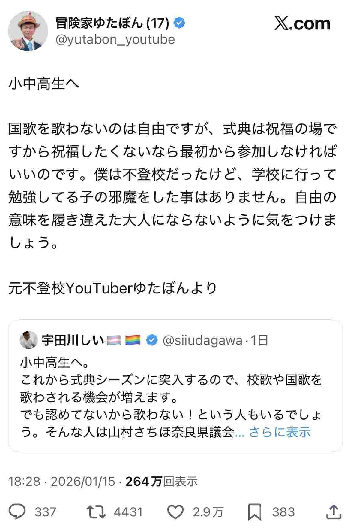 ゆたぼん「国歌を歌わないのは自由だけど歌わないなら式典に参加するな」
