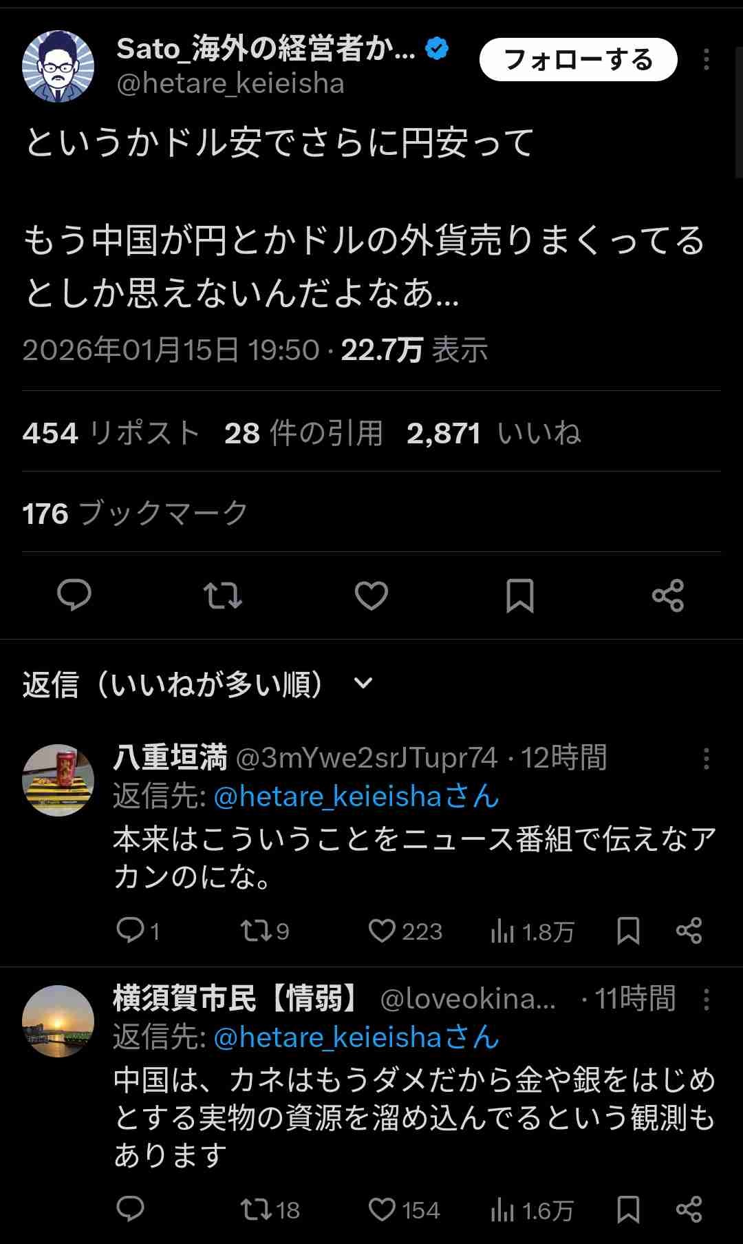 ドル円が上がり続ける理由にはならんわ - 68 名前:ここからは表現の自由でイカせていただきます 投稿日時:2026/01/16(金) 18:15:00.41 ID:8tSEItXi0