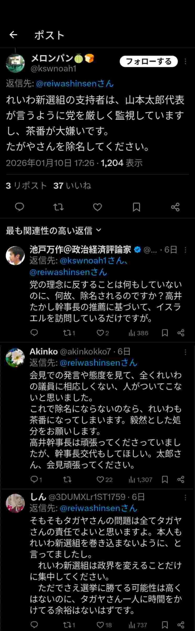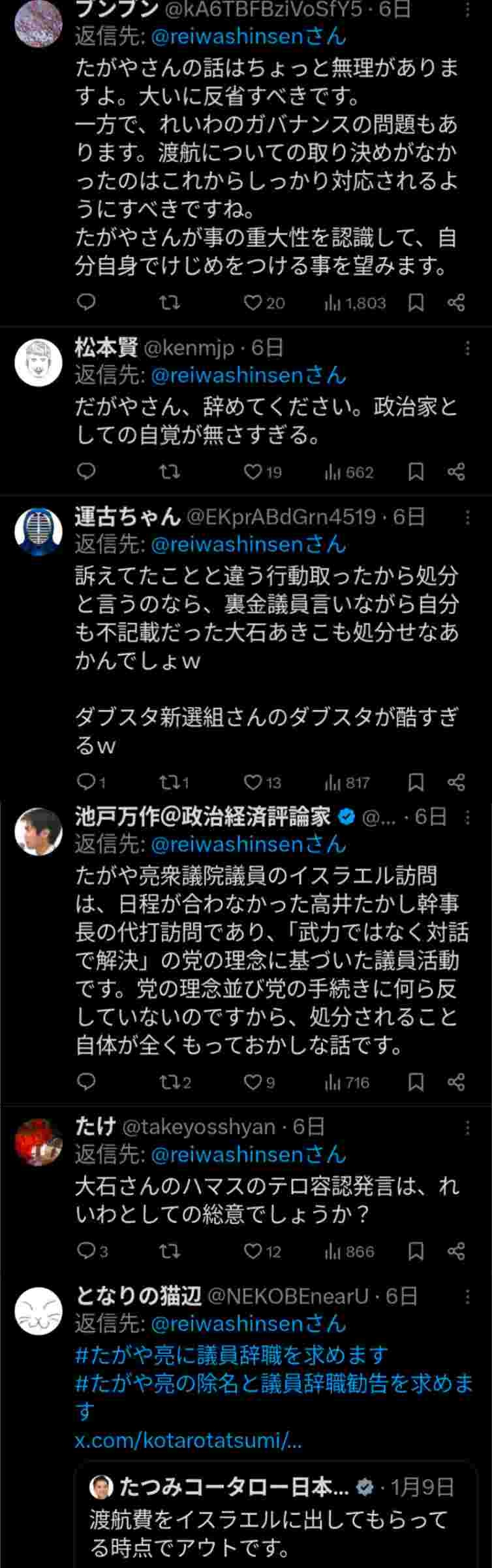 - んでガバナンス!とか言っておいて多ヶ谷にバラされたが、太郎含む幹部数人だけのブラックボックスで実質除名しちまったれいわ