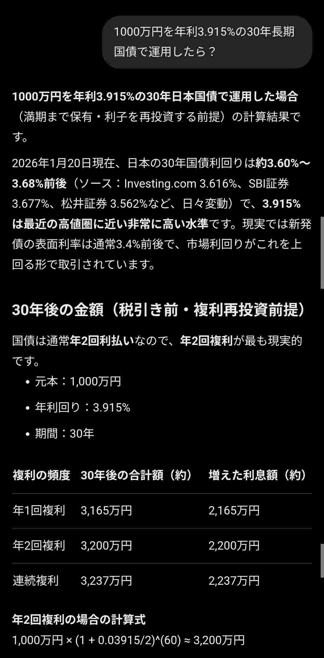 どこで売ってんの個人向け30年国債 - 17 名前:ここからは表現の自由でイカせていただきます 投稿日時:2026/01/20(火) 20:38:53.64 ID:odGWzcPK0