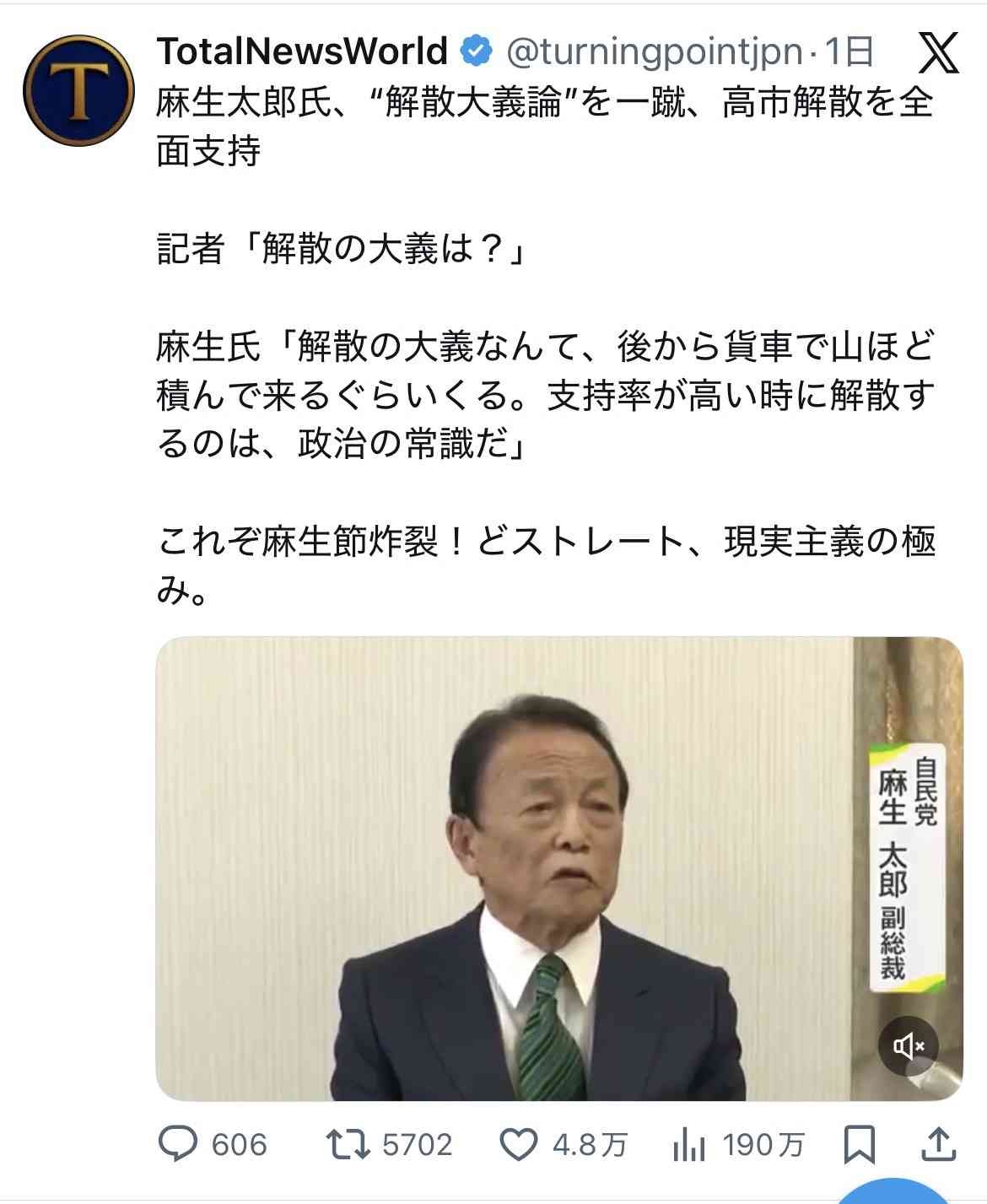 TotalNewsWorld (@turningpointjpn) on X麻生太郎氏、“解散大義論”を一蹴、高市解散を全面支持 記者「解散の大義は?」 麻生氏「解散の大義なんて、後から貨車で山ほど積んで来るぐらいくる。支持率が高い時に解散するのは、政治の常識だ」 これぞ麻生節炸裂!どストレート、現実主義の極み。x.com - 2 名前:ここからは表現の自由でイカせていただきます 投稿日時:2026/01/22(木) 08:19:41.60 ID:2/tMRPFA0