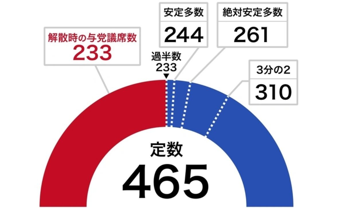 高市早苗首相(自民党総裁)は19日の記者会見で、勝敗ラインに関して「与党で過半数を目指す」と表明している。