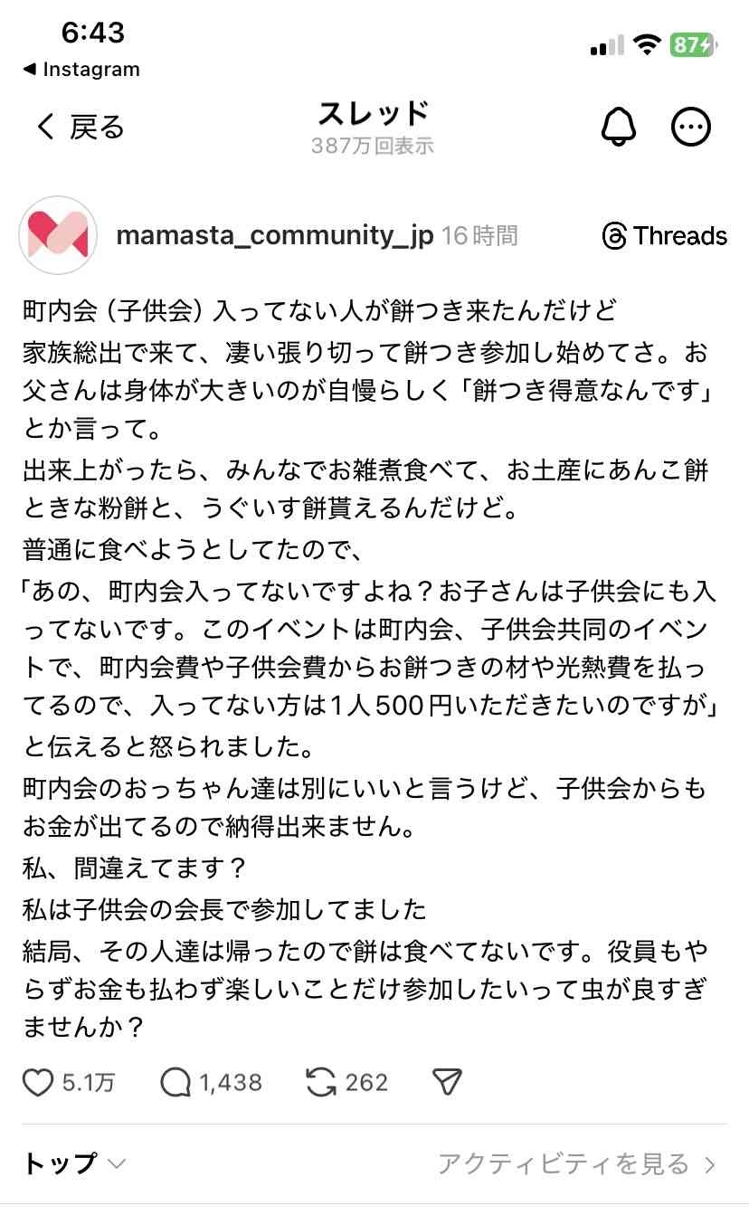 「あの、町内会入ってないですよね?お子さんは子供会にも入ってないです。このイベントは町内会、子供会共同のイベントで、町内会費や子供会費からお餅つきの材や光熱費を払ってるので、入ってない方は1人500円いただきたいのですが」